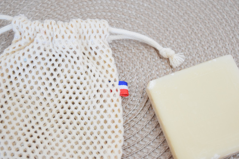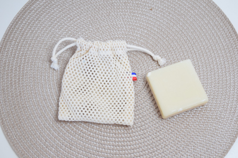 Pochette en tissu « mesh » 100% coton bio. Parfait pour y mettre votre savon solide et l’accrocher dans votre douche. Il peut également être utilisé comme filet de lavage pour vos cotons à démaquiller. (vendu sans savon)